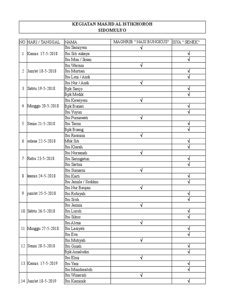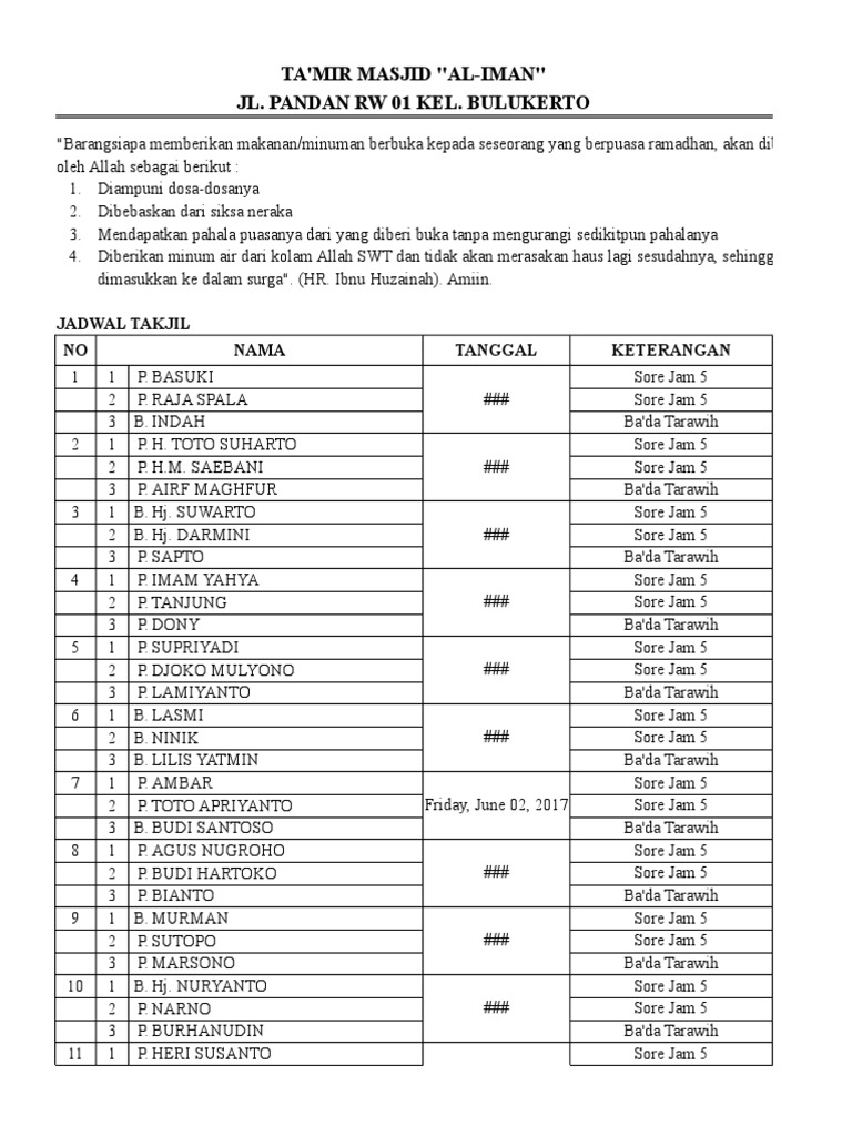 Jadwal donatur takjilan buka puasa tpa masjid jami sarah nama donatur 1 1 2 3 4 5 6 7 8 9 10 11 12 13 14 15 16 17 18 19 20 21 22 23 jumat sabtu ahad senin. Adapun untuk jadwal pelaksanaan penyedia takjil Rt. Contoh undangan tahlil diatas siap anda edit sesuai dengan kebutuhan yang diperlukan.