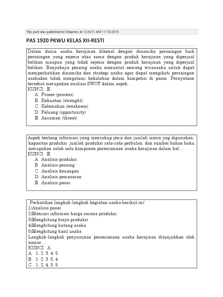 TC 60 0 60. Bank Soal Prakarya dan Kewirausahaan PKWU Soal prakarya dan kewirausahaan kelas 12 semester ganjil K13 edisi revisi untuk siswa SMAMASMKMAKSederajat postingan ini berisikan materi soal tentang Usaha Kerajinan untuk Pasar Lokal Bab 1 seperti soal tentang usaha dan produksi kerajinan berdasarkan kebutuhan pasar lokal serta evaluasi hasil perhitungan media promosi dan pemasaran produk. Produk Kreatif Dan Kewirausahaan - ProProfs Quiz Lengkap - 40 Contoh Soal USBN Kewirausahaan Untuk SMKSTM Terbaru.