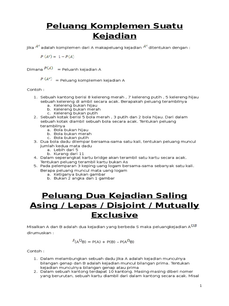 Contoh soal Dalam sebuah kotak terdapat 6 bola merah dan 4 bola putih. 21 n 1. Peluang Kejadian Peluang Komplemen Suatu Kejadian Dalam teori himpunan himpunan bukan A himpunan A dan S A A.